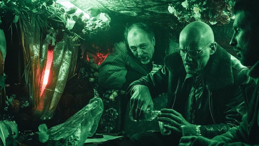 Petrov’s Flu er en filmatisering af Aleksej Salnikovs roman Familien Petrov i og omkring influenzaen, der blev oversat til dansk i 2021, og som kan læses på e-reolen, hvis man har lyst. Det er godt nok en virkelig mærkelig struktureret roman, som jeg var lidt spændt på hvordan i alverden man skulle kunne filmatisere. Det går meget godt de første par kapitler: Vi møder Petrov, der er mekaniker, laver tegneserier, hvis kone vil skilles, og som har fået en ret voldsom influenza. Han forsøger at komme hjem med bussen, men da hans ven Igor kører op på siden af ham i en ligvogn, og inviterer ham på druk, tager han med. I andet kapitel vågner han op fra sin brandert, og forsøger igen at komme hjem.